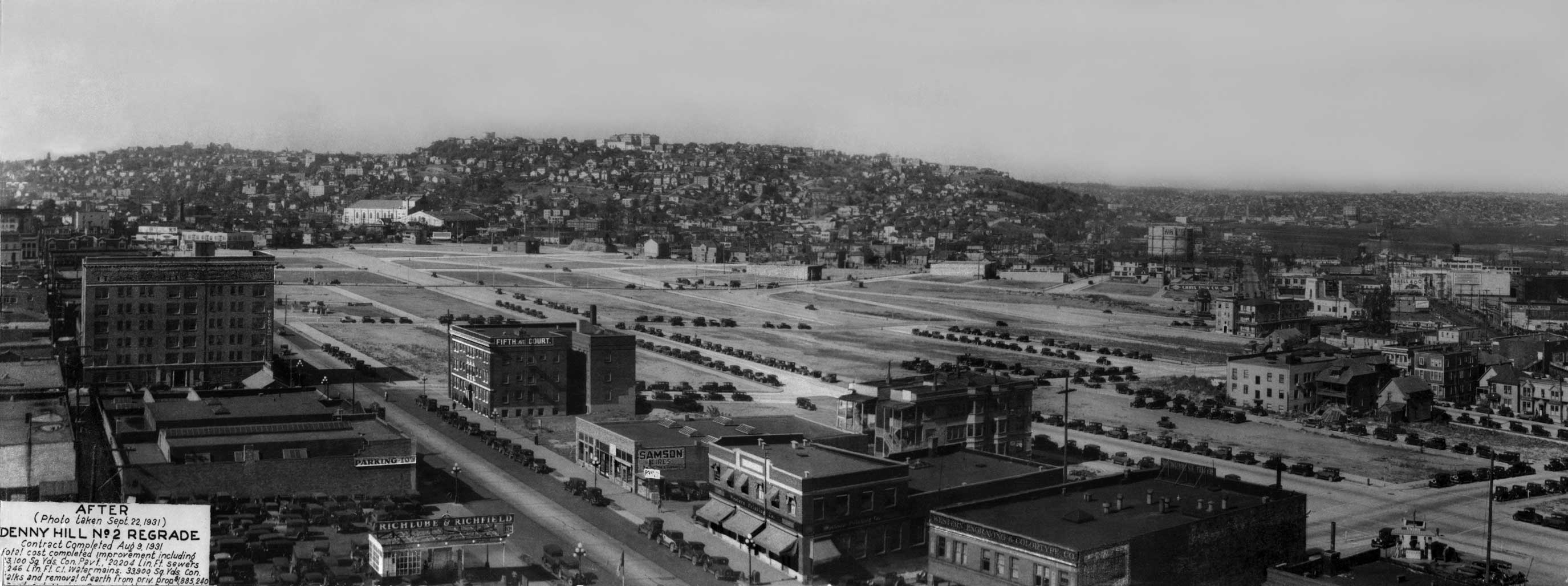 THEN 2: The pre-Regrade No.2 brick business buildings on Fifth Avenue survived the cutting, which otherwise turned the last of Denny Hill into undeveloped land that resembled a sprawling parking lot. The photo was taken on September 22, 1931. Like the 1928 panorama and Jean Sherrard’s late 2016 repeat, the “after” shot was taken from the roof of Hotel Andra, formerly the Claremont Hotel (1926), at the northeast corner of Virginia Street and 4th Avenue. (Courtesy, Seattle Municipal Archives)