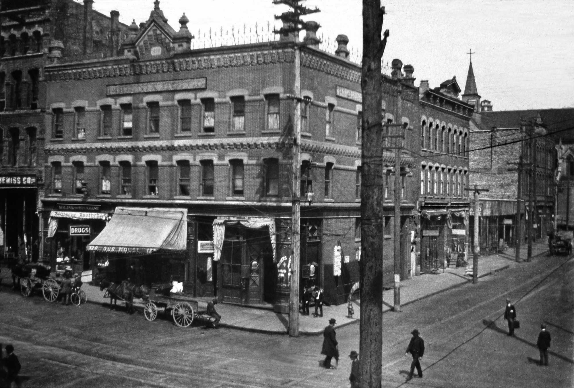 THEN: The Phoenix Hotel on Second Avenue, for the most part to the left of the darker power pole, and the Chin Gee Hee Building, behind it and facing Washington Street to the right, were both built quickly after Seattle’s Great Fire of June 6, 1889. (Courtesy: Museum of History and Industry.)