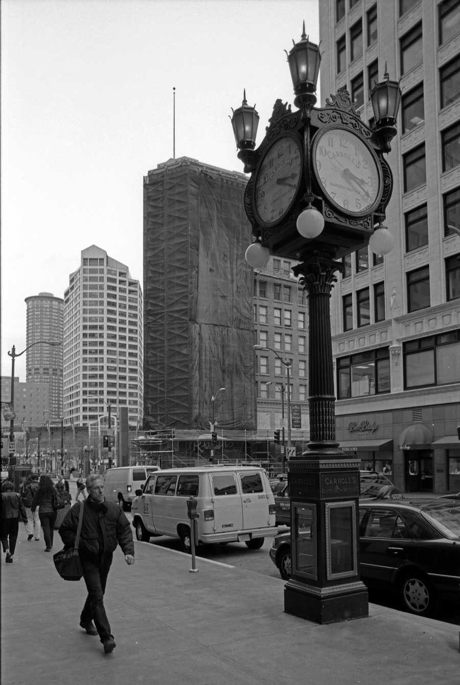 clock-4th-ave-sidewalk-clock-ca-1999-web March 5, 2017 900 × 1339 Seattle Now & Then: Big Clock in Big Snow, 1916 One of the few survivors: the clock on Fourth Avenue south of Pike Street. I remember taken the photo but not when, so I contribute a circa 1999 date.