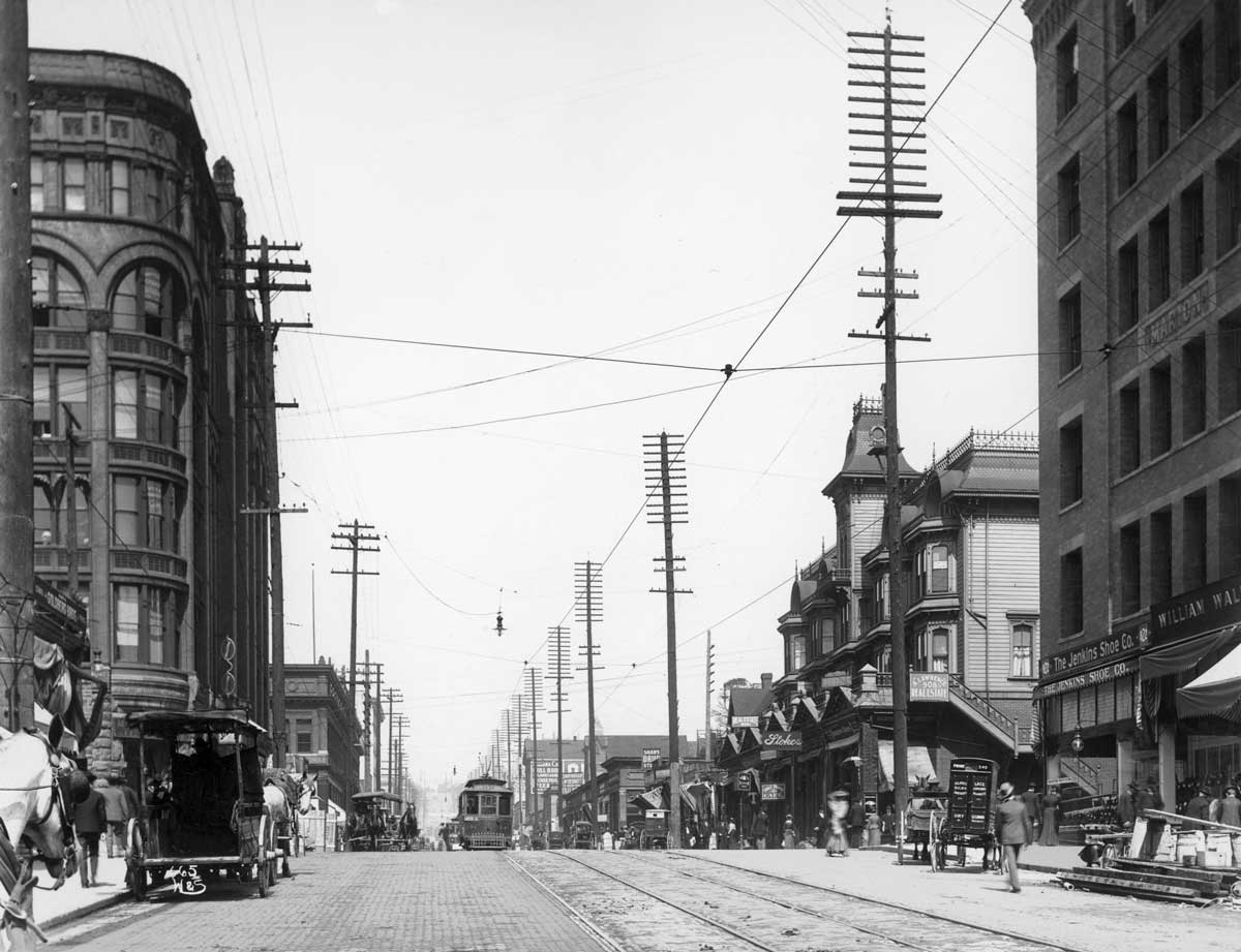 Ca. 1903, with the pioneer endurer, the Stetson Post Building on the right, and the post-1889 fire red brick landmark, the Burke Building, on the left. Of course the view looks north on Second Avenue through its intersection with Marion Street. (Courtesy, Lawton Gowey)