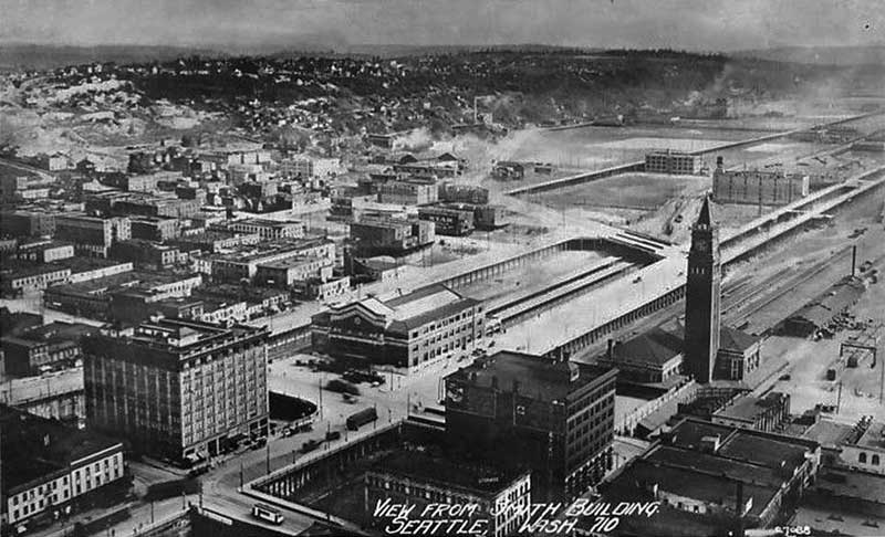Armour-plus-fm-Smith-Tower-early-WEB April 9, 2017 800 × 486 Seattle Now & Then: The Armour Building Taken from the Smith Tower, this real photo postcard reveals the neighborhood and the relative size of the Armour building (just below the subject’s center) and the Richmond Hotel, far left.
