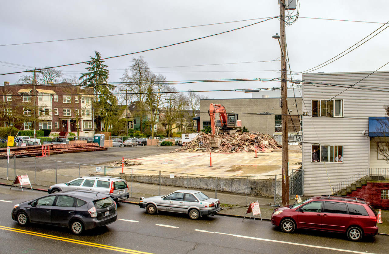 NOW: With a fortunate fate for Jean’s repeat photography, the southwest corner of 13th Ave. East and Union Street was recently cleared revealing the row of seven frame houses north of Spring Street that in 1900 were squeezed together on four lots on the east side of Thirteenth Avenue. The large green home survives in the ‘now’ although without its pointed tower that was “remodeled” away. The green home can be discovered in the “then” above the florist’s home.