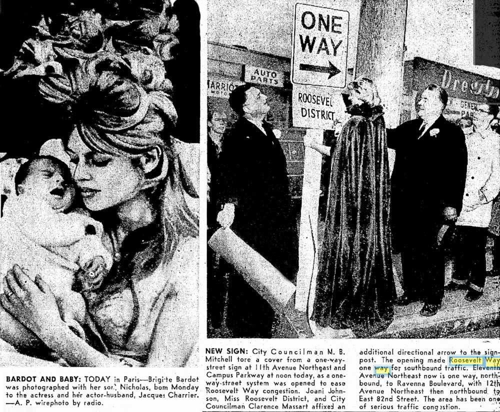 Miss Roosevelt District helps apply or install the one way sign for 11th Ave. N.E in early 1960. She shares the page with Bridget Bardot, her new baby, and flamboyant permanent.