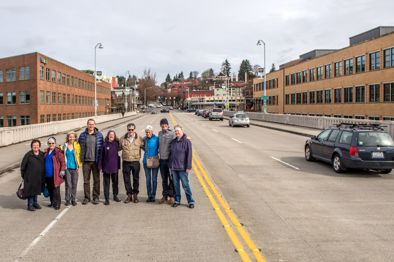 NOW: Members of the Fremont Historical Society pose on the Fremont Bridge, prudently to the side of the busier northbound lane and also well ahead of the traffic advancing south from the 34th Street intersection behind them. Member Judie Clarridge, who helped arrange the “shoot,” stands on the far left side. She also advises that Valarie Bunn, far right, “does a good job about finding things” and was especially helpful in researching the featured photo. We should also note that Heather McAuliffe, the Society’s founder in 2004, is present and dressed in yellow and blue on the left. The Fremont Historical Society’s website is http://www.fremonthistory.org.