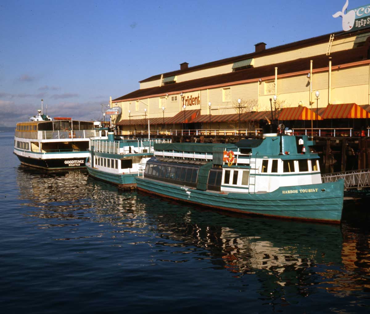The Harbor Tourist navy has here added The first (I think) of the Lynn Cambell’s Goodtime boats. Notes the Seattle Aquarium sign (with the neon neon whale) at the end of Pier 56, and at its side Trident, the then import shop. Take some time to read here below Trident’s curious promotion of its exotic service to the kitsch consumer.