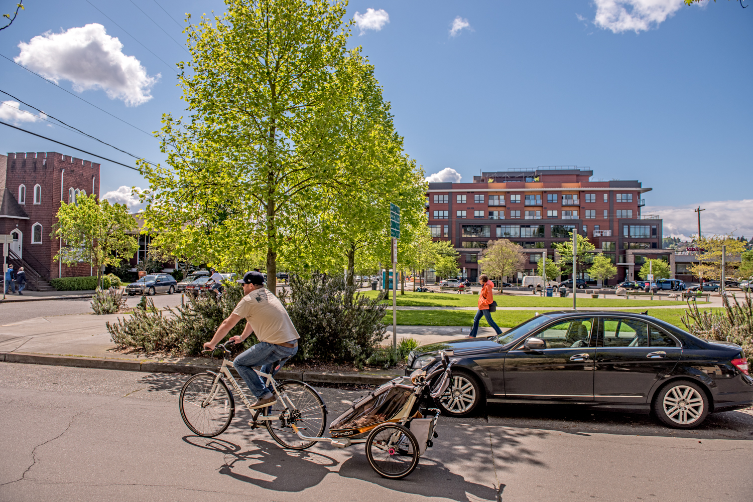 NOW:“Public Plaza” is sometimes added to the name Ballard Commons Park. It is one of Ballard’s few parks, and like the community it too is meager on trees. However, for warmer days it features a “Spraypark,” which is a well-wrought fountain for kids to run through.