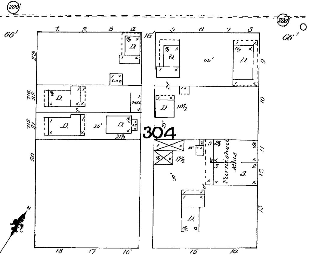 A detail from the 1888 Sanborn real estate map showing block 304 bordered by Columbia Street at the top and 7th Avenue on the right. The first two parts of the row built along the west side of 7th Avenue take lots 11 & 12. The back-porch is included with a dashed line. Lots 5-thru-8 would be taken by the fire station. The house on lot 15, facing Cherry Street, would survive 70-plus years of changes in the block.
