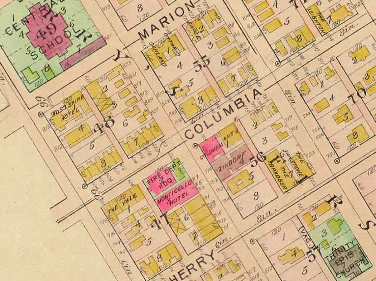 The featured block in this detail from the 1912 Baist Real Estate map is No. 47. Here the row at the northwest corner of Cherry Street and Seventh Avenue has grown to include five residences. The brick Monticello Hotel is just north of the row and the fire department headquarters north of the hotel.