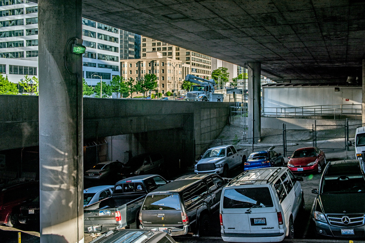 NOW: A notable surviving landmark, a large apartment building, is repeated upper-left at the northwest corner of Marion and Sixth Avenue. Embellished with bay windows, it has changed its color at least once, from red brick to a painted beige or buff. As historic preservationist Diana James discovered while writing Shared Walls, a history of Seattle’s apartments built between 1900 and 1939, it has also changed its name at least four times, beginning as the Laveta Flats in 1904, followed by the Highland, the Amon, and since the mid-1930s, the Dover.
