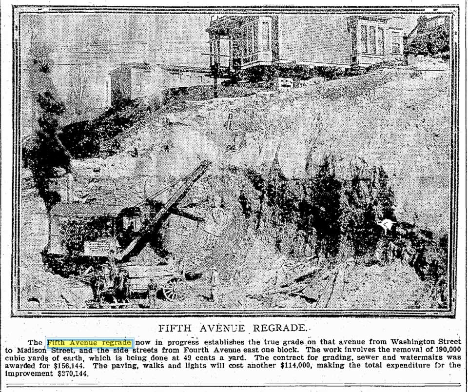 x-5th-ave-regrade-ST-3-30-1911-web July 9, 2017 960 × 804 Seattle Now & Then: A Fifth Avenue Regrade, 1911 The same corner a little later and still looking north thru Cherry on 5th. Note that the residence on top has been lifted to blocks for moving it to a new but not indicated location. Copies from The Times for March 30, 1911.
