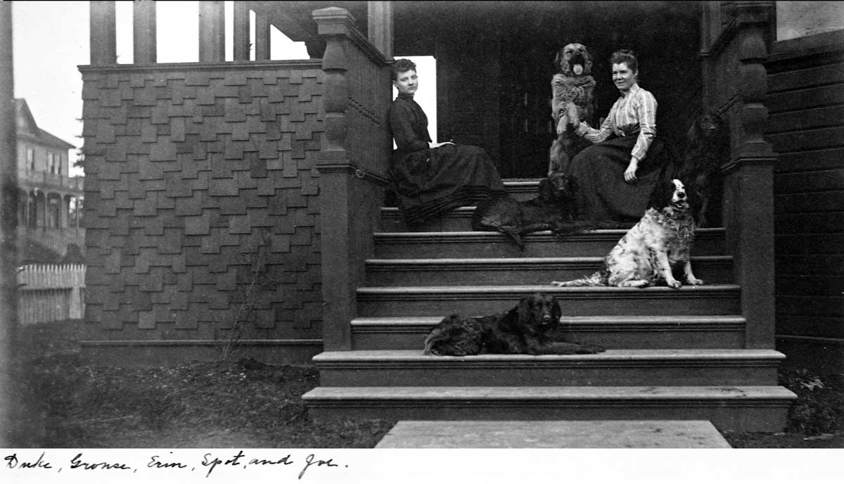 home-Lowman-album-2-women-on-porch-w-five-dogs-[Duike,-Gronse,-Erin,-Spot-and-JoeWEB July 23, 2017 1200 × 688 Seattle Now & Then: ‘The City is More Than Human’ Several pets on the front steps of the Lowman Home at the southeast corner of Marion Street and Boren Avenue ca. 1890. (Courtesy, Michael Maslan)