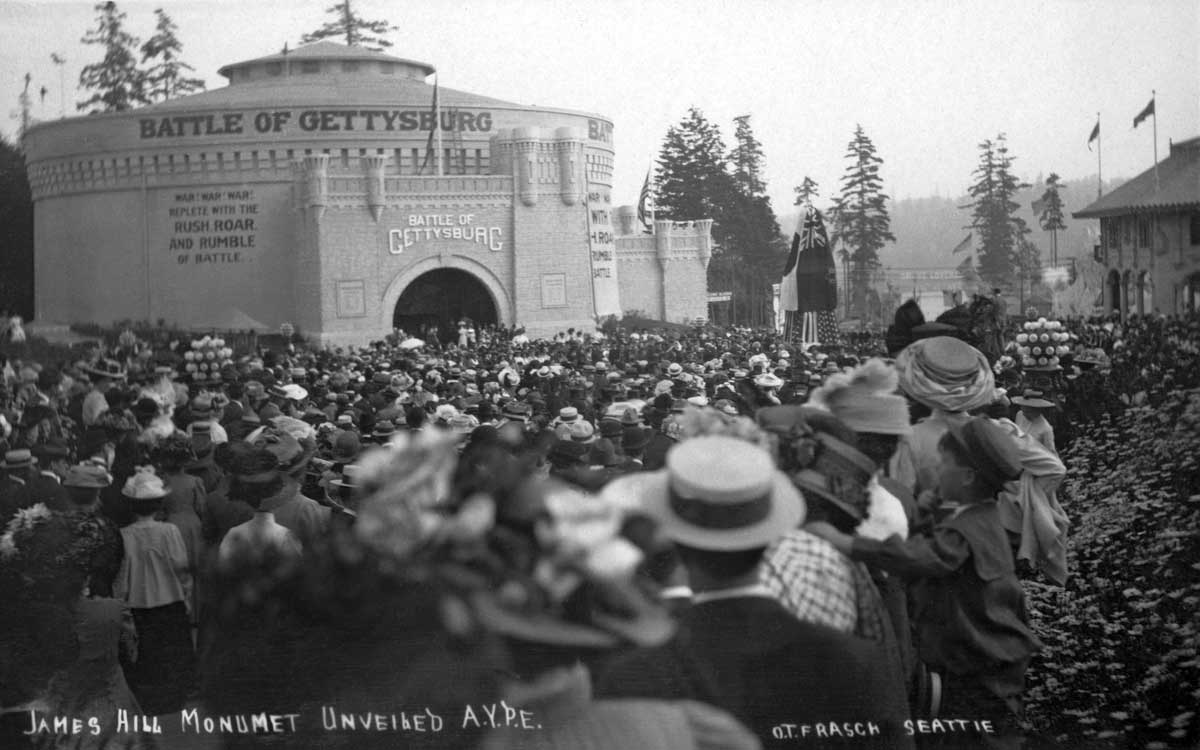 x-James-Hill-unveiling-Gettysburg-+-web August 27, 2017 1200 × 750 Seattle Now & Then: The ‘Empire Builder’s’ Bust Prelude to the unveiling of the James Hill bust. The still veiled bust on its pedestral stands here above the crowd right-of-center. The Battle of Gettysburg was one of the Expo’s more popular attractions.