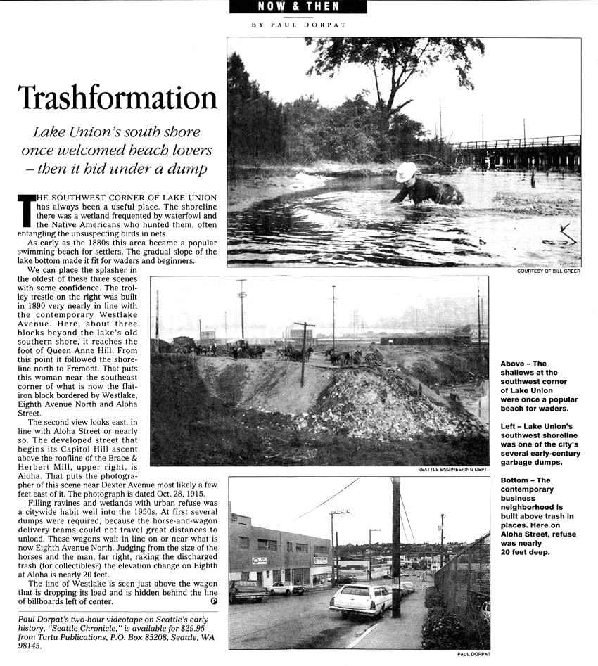 If you are familiar with the brother and sister posing on the cover of Seattle Now and Then Vol. 1 (1984) here is their mother also splashing at the southwest corner of Lake Union, between the Westlake Trestle and the lake’s meander line. This playf was exposed circa 1903, a few years before the swimming “hole” was filled with city trash.
