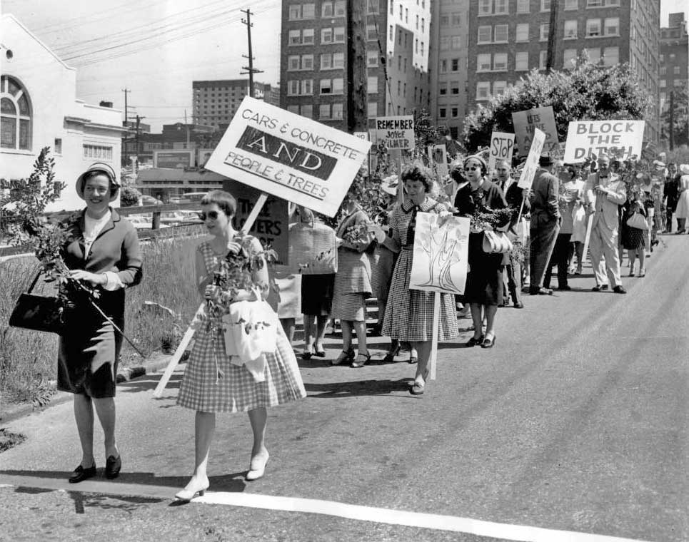 A like of mostly protesting women march west on Spring Street with the Lowell Apts behind them and the Christian Scientists over their right shoulders. They were trying to stop the ditch, and/or have a lid put on it. By this time, ca. 1961, the block is for parking, except for the C.Scientists and the