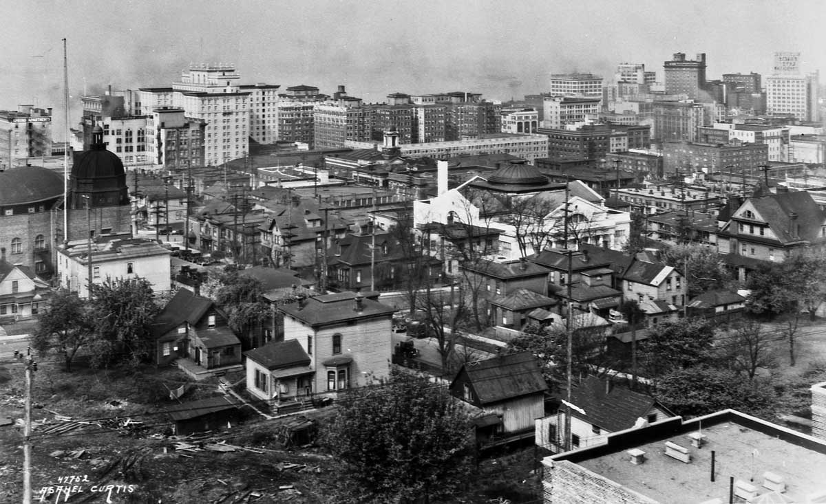 Looking northwest from the roof or upper-floor of the Sorrento Hotel at the northwest corner of Terry Ave. and Madison, to the new and gleaming Christian Scientist sanctuary that crowds ‘our’ block bordered by Spring and Seneca Streets, Seventh and Eighth Avenues, from its northeast corner. The Onarga’s’ rooftop is left-of-center.