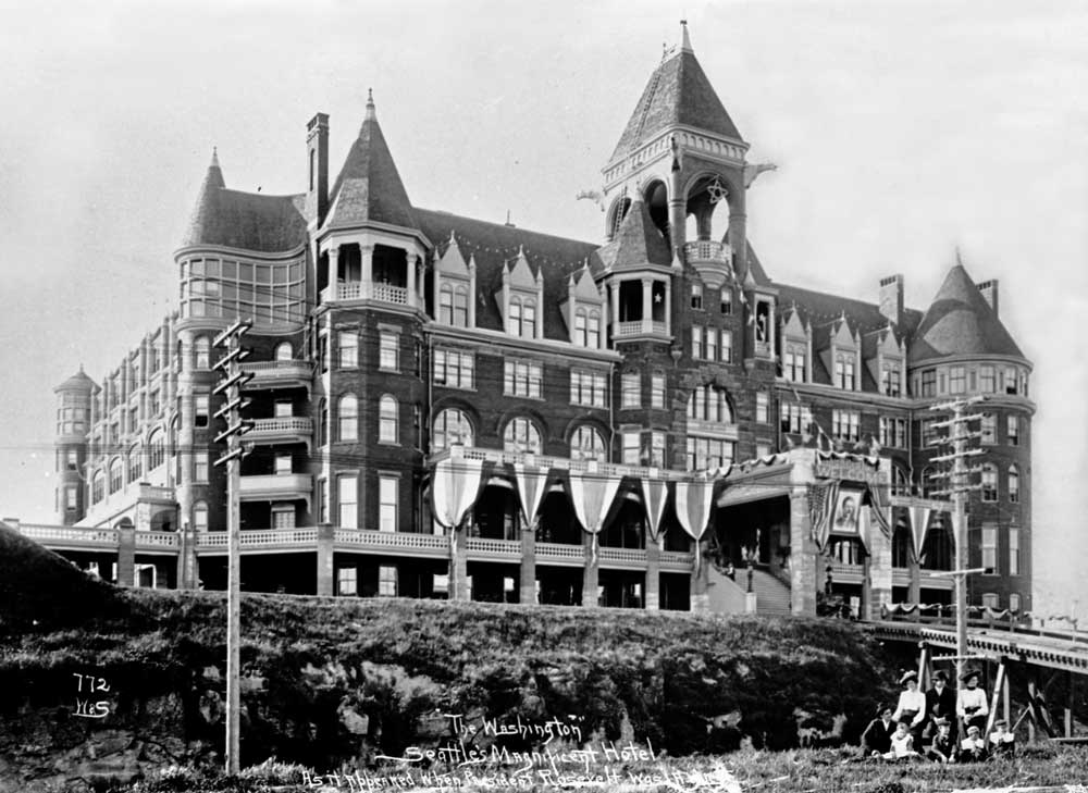x-Denny-Washington-Hotel-over-Stewart-ditch-w-posing-grop-and-bunting-for-opening–TR-visit-in-1903-WEB October 1, 2017 1000 × 729 Seattle Now & Then: The Denny Hotel Looking north over the Steward Avenue “ditch” at the decorated hotel at the time of its opening in 1903. (Courtesy, University of Washington Libraries, Northwest Collection)