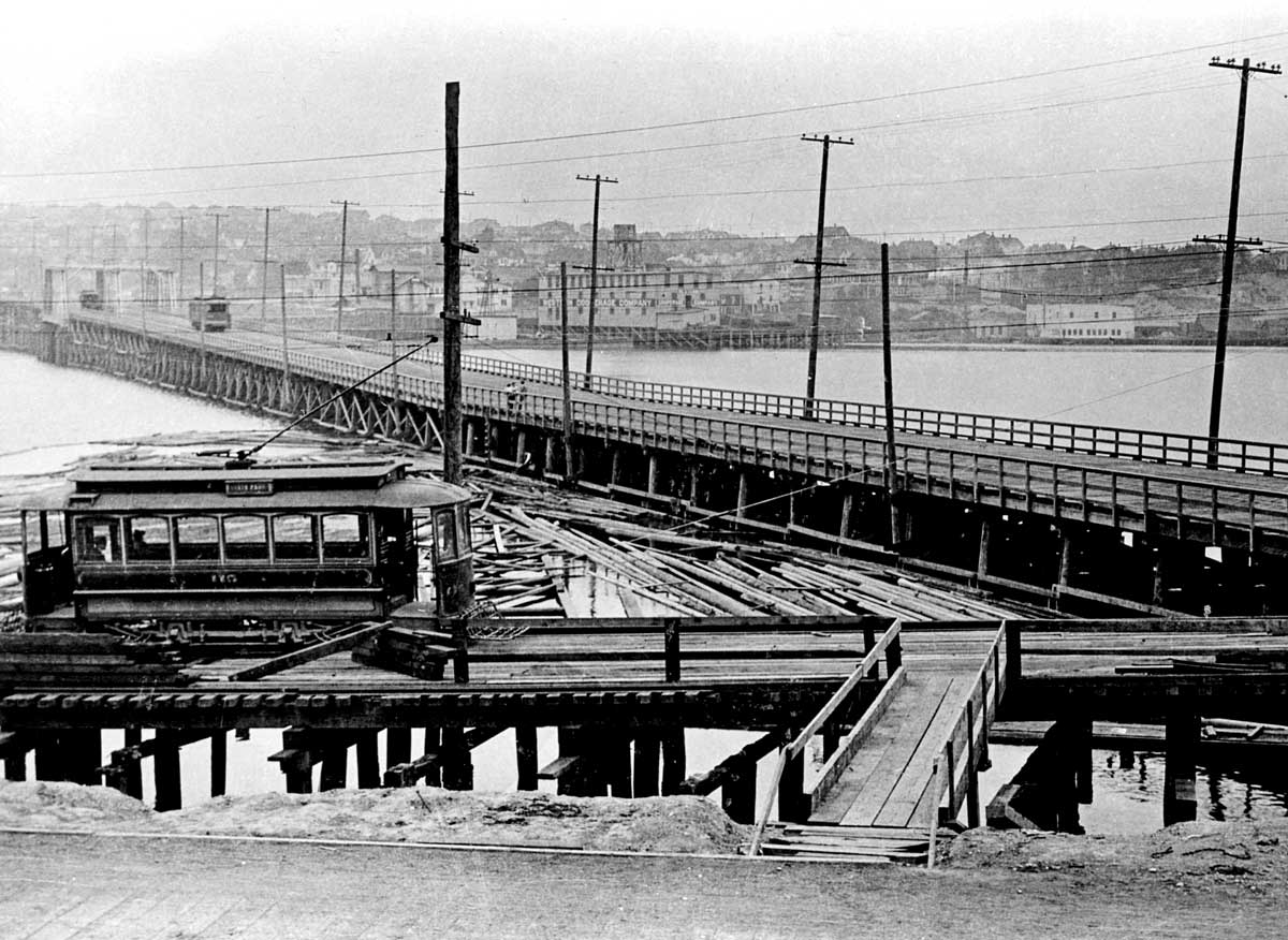 x Stone-Way-Bridge-fm-Westlkae-with-Trolley-on-Westlake-WEB October 8, 2017 1200 × 876 Seattle Now & Then: Lake Union Logs The Stone Way bridge was built in 1911 to help handle north-end traffic during the construction of a new Fremont Bridge. This view looks north over both the Westlake Trestle and the Stone Way Bridge.