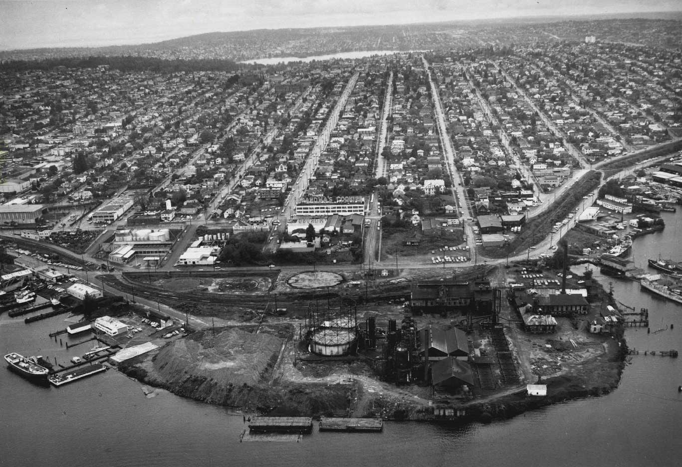 1.-Grandmas-Cookies-aerial-WEB December 24, 2017 1367 × 936 Seattle Now & Then: Wallingford Call Grandmas Cookies look over the closed gas plant near the beginning of its dismantling. Note the rising hill on the left of this Wallingford Peninsula.