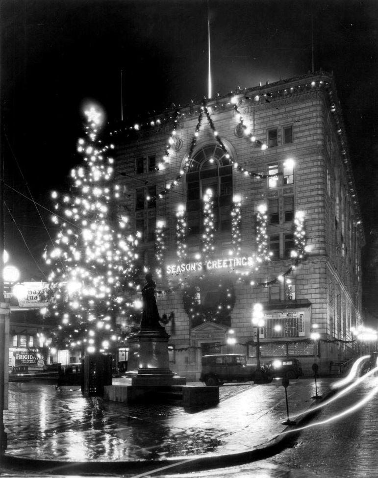 It’s winter time — but there’s warmth and cheer reflected everywhere. Everyone has that Christmassy feeling. It’s in the air. The Times was among the first to catch it and forthwith ordered its Christmas tree and Yuletide decorations for its home. Thousands of persons have been attracted by The Times tree and decorations. Many have considered it worth while to make special trips to Times Square to view the decorations, particularly at night when hundreds of red, green and white lights twinkle merrily from evergreen foliage. The decorations at night are shown with the illuminated tree towering in the foreground above the statue of John H. McGraw, former governor of Washington, and the artistic decorative scheme carried out over the main entrance of The Times Building on Fifth Avenue in the background.