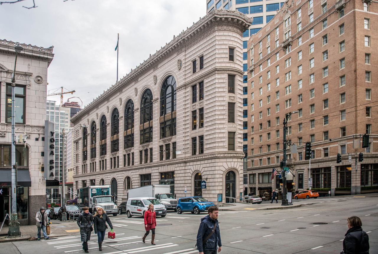 NOW: The Waverly Apartments, razed in 1926, were replaced by the still-standing Mayflower Park Hotel. Since 1916 the terra-cotta clad Times Square Building has filled the flatiron block bordered by Olive Way, Stewart Street, on the left, and Fourth Avenue, in the foreground.