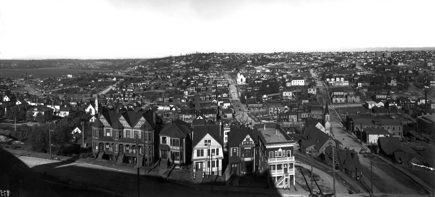 Before: Pan looking east from the Denny (aka Washington) Hotel on Denny HIll (see its shadow at the bottom) to the Capitol Hill horizon, with Fourth Avenue at the bottom and the triangle block of Steward, 4th, 5th and Olive Way, split at the bottom-right corner. The block holds the first sanctuary for St. Marks Episcopal. Lake Union is far left. (And Wallingford too!)