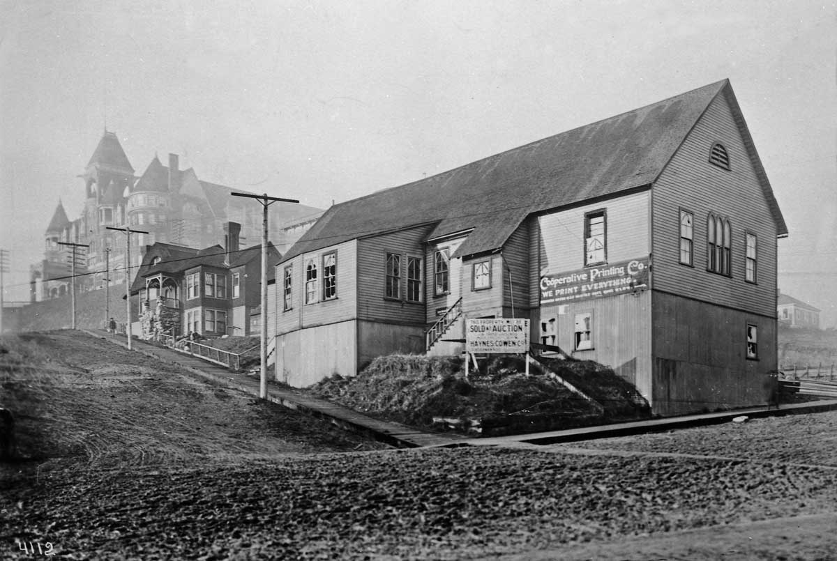 x St.-Marks-Olive-and-5th-WEB January 7, 2018 1200 × 805 Seattle Now & Then: Golden Potlatch Parade, 1911 The same triangular block seen here looking west from Fifth Avenue with the Denny aka Washington Hotel behind it on the south summit of Denny Hill, and so before the regrade.