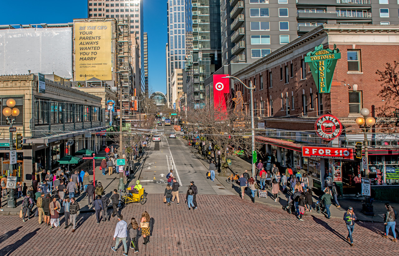 PIKE ST. ca. 1930 fm Pike Market NOW April 14, 2018 1280 × 823 Seattle Now & Then: The Market’s Front Door NOW: In the market’s 111th year, the four modest corners of this brick-lined, walk-all-ways intersection welcome the footsteps of about 35,000 people every day.