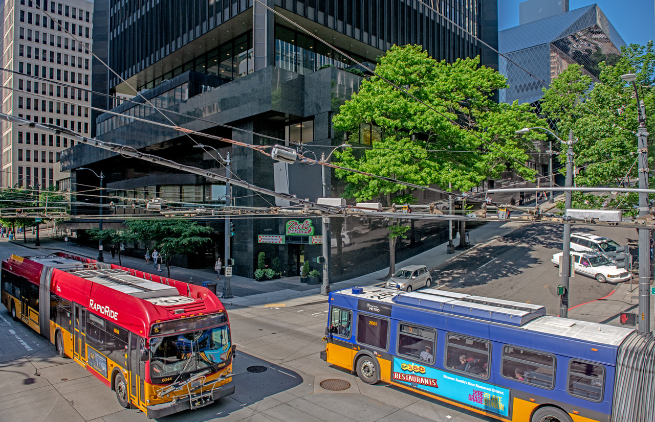 THEN: Sighting northwest through the intersection of Madison Street and Third Avenue, circa 1916. (Courtesy, Museum of History and Industry)NOW: SeaFirst Bank began buying up the block in the late 1950s and opened its fifty-floor tower in 1968.