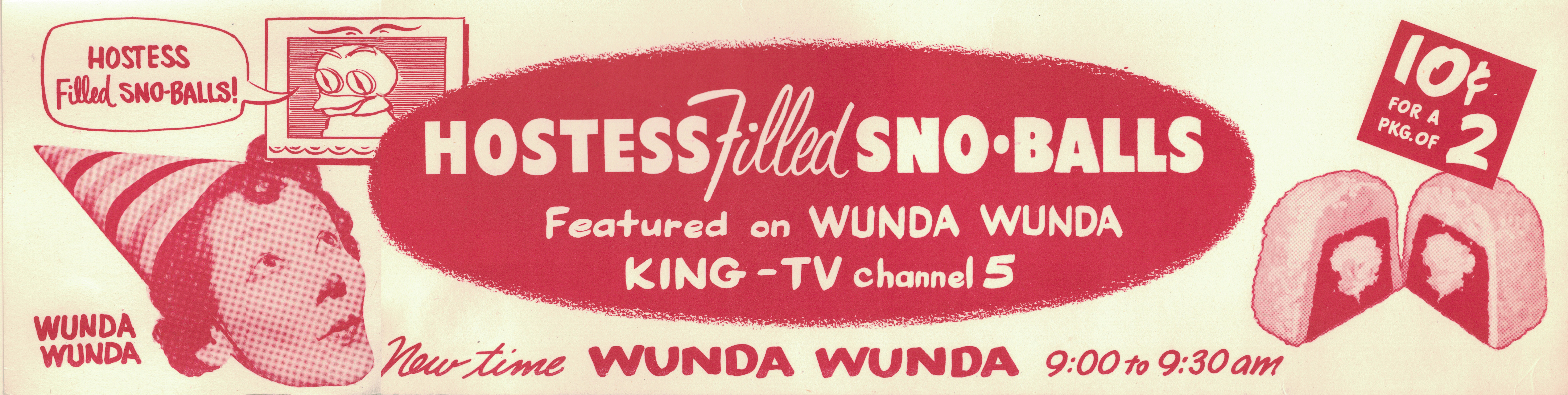 Among Ruth Prins’ most prominent endorsements was for the Hostess brand of cupcakes. This ad also illustrates how KING-TV sometimes tried moving the time slot for “Wunda Wunda,” but parents consistently asked that it return to its noon slot so their kids could eat lunch while watching it and then go down for a nap. (Courtesy Debra Prins)