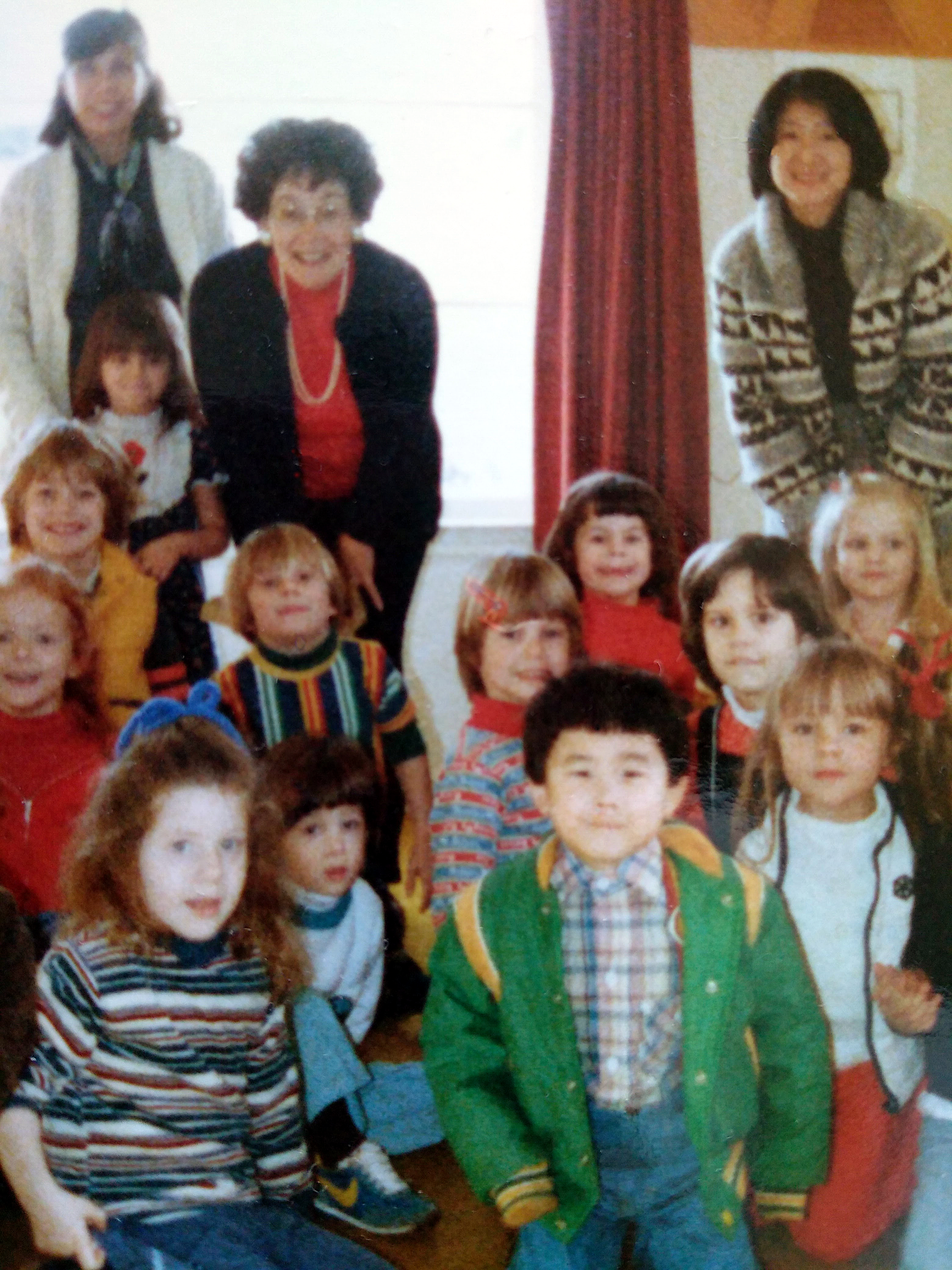 Kentaro Yamada (green jacket) poses in 1980 at Ruth Prins’ school for kindergartners and preschoolers in Magnolia. Prins (top center) and Kentaro’s mother, Teruko Yamada (right), look on. Kentaro Yamada is now an artist in Chicago. (Courtesy Mitsuo and Teruko Yamada)
