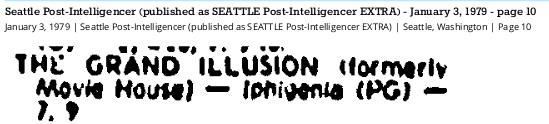 1979 01-03 SPI p10 April 5, 2023 549 × 124 Seattle Now & Then: the Grand Illusion Cinema, 1937 Jan. 3, 1979, Seattle Post-Intelligencer, p10.