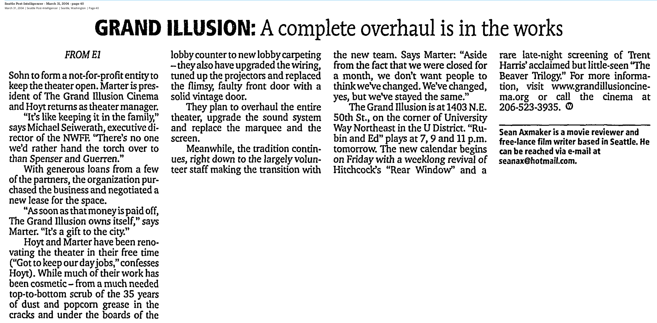2004 03-31 SPI p40 April 5, 2023 2236 × 1102 Seattle Now & Then: the Grand Illusion Cinema, 1937 March 31, 2004, Seattle Post-Intelligencer, p40.