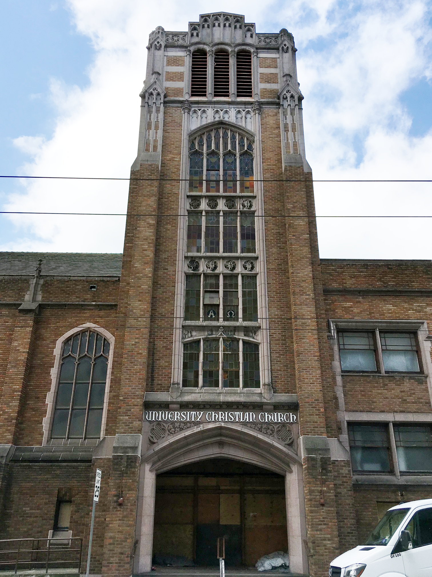 2019 University Christian Church entrance April 5, 2023 1512 × 2016 Seattle Now & Then: the Grand Illusion Cinema, 1937 University Christian Church, which peeks out at the upper left of our first “Then” photo, stands in 2019 soon before its demolition. (Eugenia Woo)