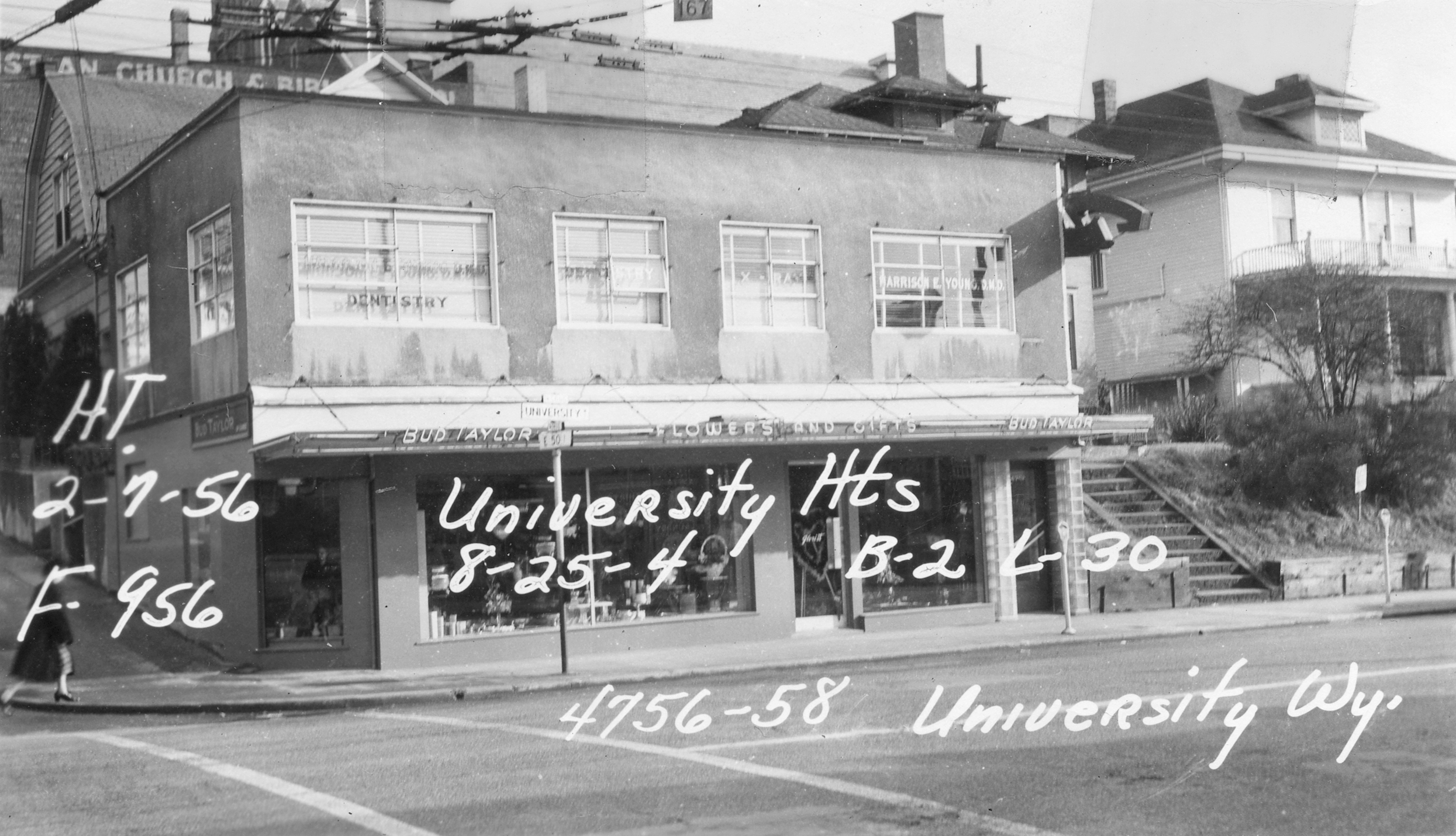 THEN5: This Feb. 7, 1956, view, facing southeast, shows the same building, with Bud Taylor Flowers and Gifts on the first floor and dentist Harrison E. Young practicing in the second-floor footprint of today’s Grand Illusion Cinema. (Puget Sound Regional Branch, Washington State Archives)
