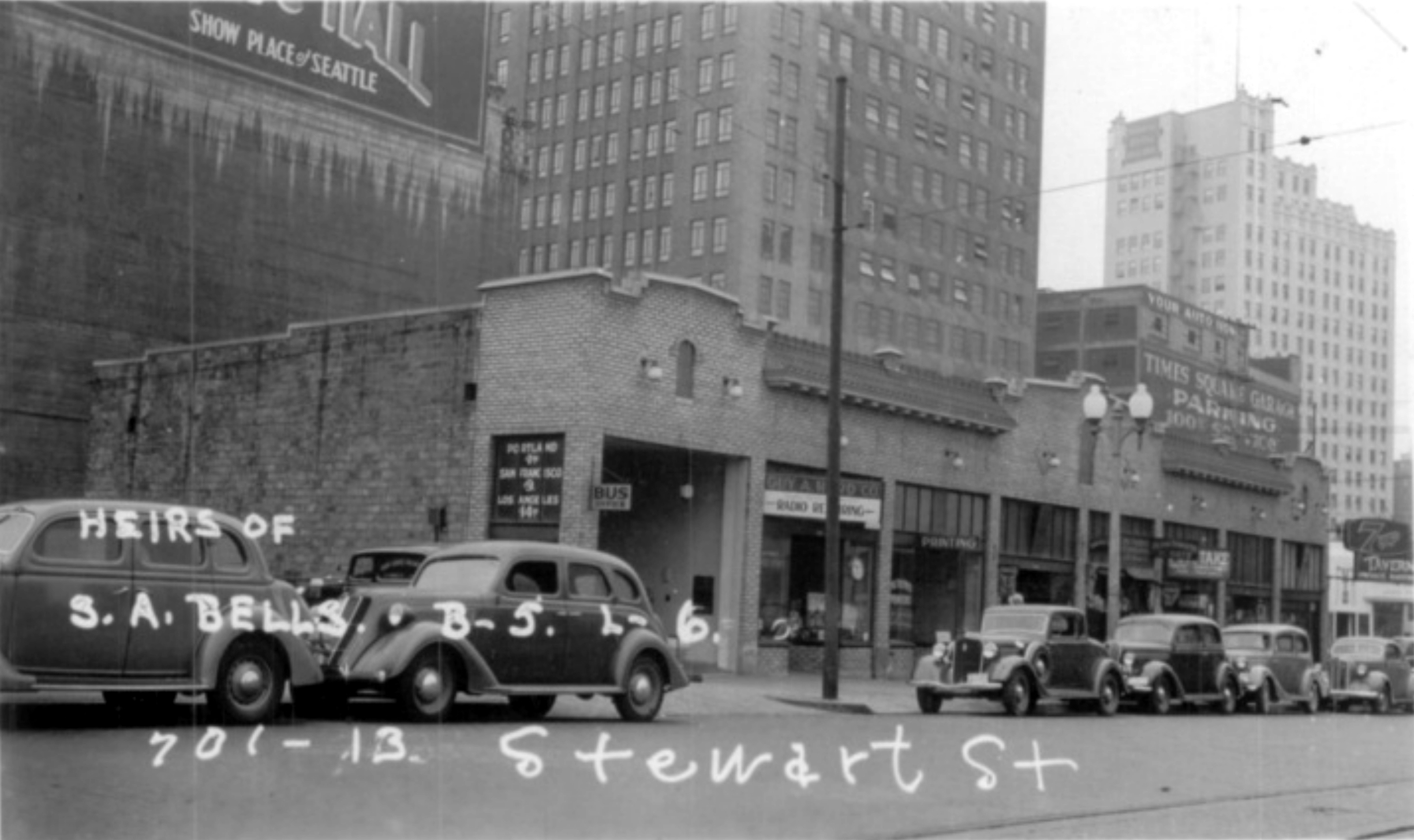 1938~ PRC 701-713 Stewart St April 19, 2023 2450 × 1456 Seattle Now & Then: The Door coffeehouse, 1959 Around the corner from The Door site was this section of Stewart Street north of Seventh Avenue, shown in about 1937. (Puget Sound Branch, Washington State Archives)
