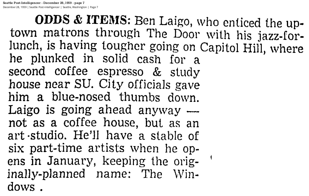 1959 12-28 SPI p7 Watson April 18, 2023 1034 × 656 Seattle Now & Then: The Door coffeehouse, 1959 Dec. 28, 1959, Seattle Post-Intelligencer, p7, Emmett Watson.