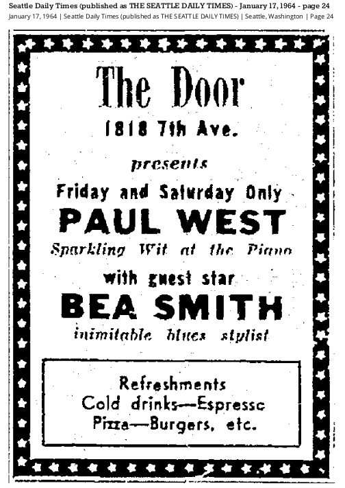 1964 01-17 STimes p24 April 18, 2023 504 × 711 Seattle Now & Then: The Door coffeehouse, 1959 Jan. 17, 1964, Seattle Times, p24.