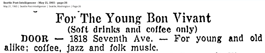 1965 05-21 SPI p26 April 18, 2023 1019 × 207 Seattle Now & Then: The Door coffeehouse, 1959 May 21, 1965, Seattle Post-Intelligencer, p26.