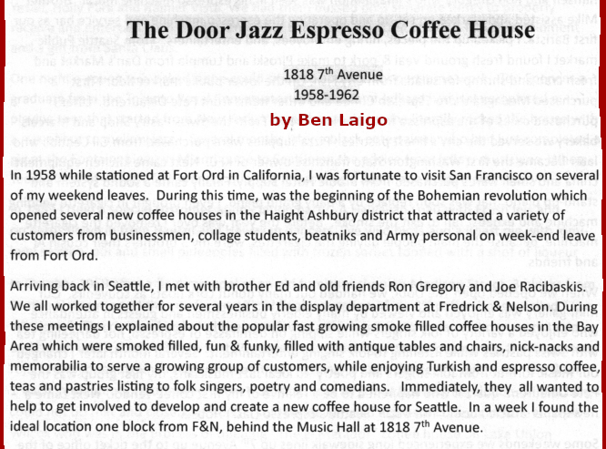 The Door history thumb April 19, 2023 666 × 493 Seattle Now & Then: The Door coffeehouse, 1959 Click this image to see a pdf of a history of The Door, written by its founder, Ben Laigo.