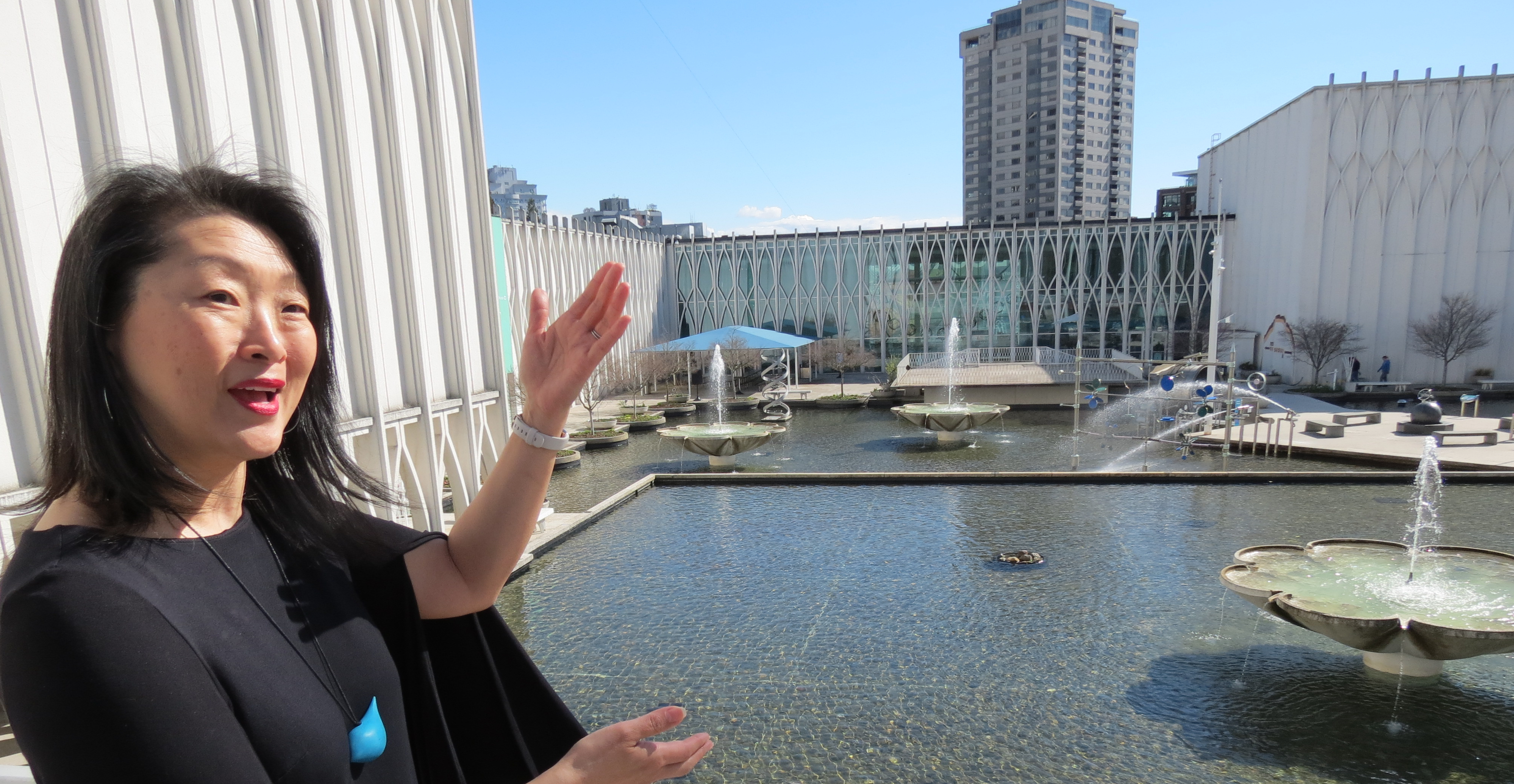 NOW2: Grace Kim, PacSci consultant from the Seattle-based Schemata Workshop architecture and urban-design practice, discusses the rear pool, which scenarios call for filling with a meadow. Kim says that the PacSci rectangular basins’ constantly moving water does not reflect surrounding images, but nevertheless they are deemed reflecting pools because they prompt personal reflection. (Clay Eals)