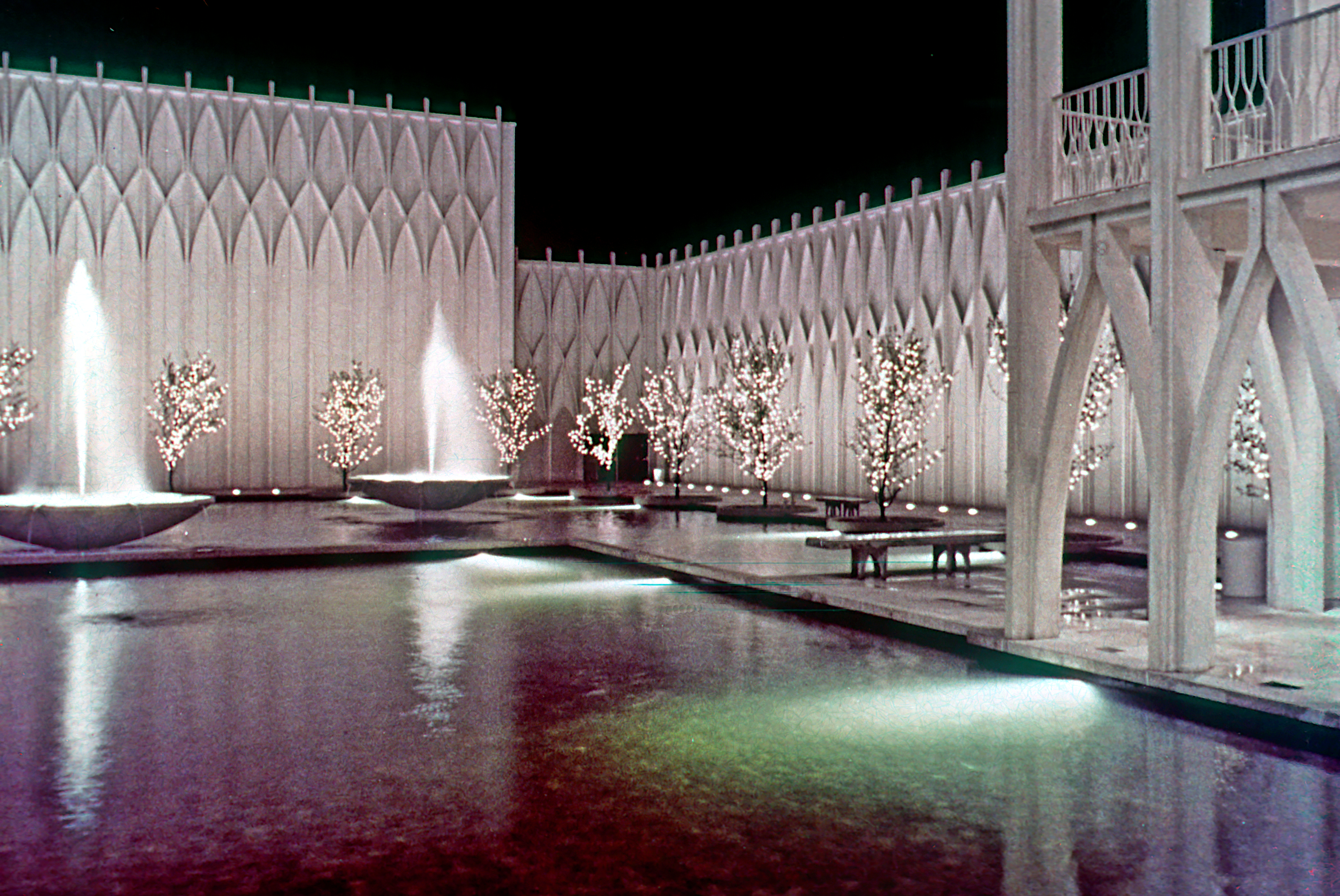 N&T PacSci meadow THEN2 May 3, 2023 3552 × 2376 Seattle Now & Then: rear reflecting pool at PacSci (Pacific Science Center), 1962 THEN2: At ground level in 1962, colored lighting illuminates the rear pool. (Seattle Municipal Archives)