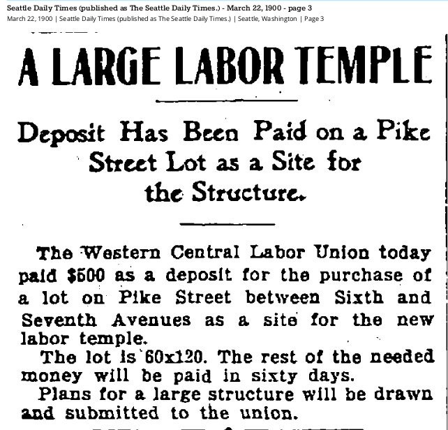 1900 03-22 STimes p3 May 16, 2023 642 × 616 Seattle Now & Then: Seattle Labor Temple, 1955 March 22, 1900, Seattle Times, p3.