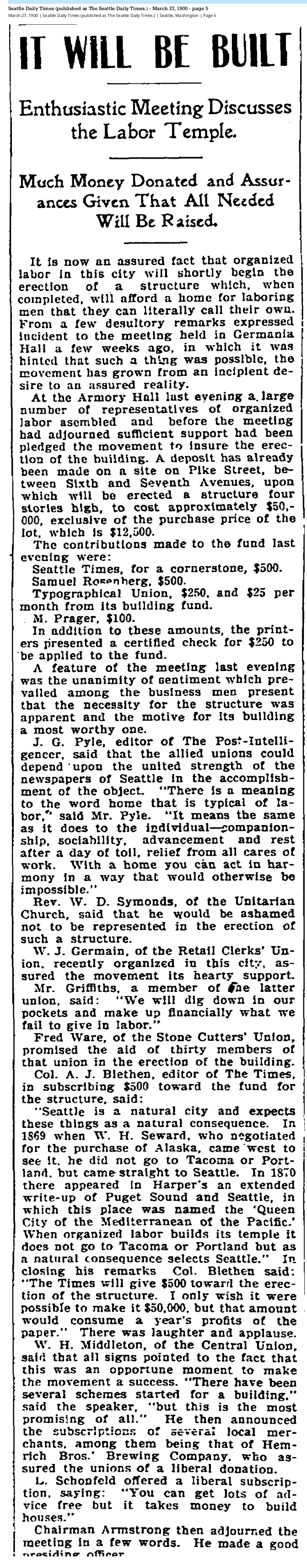 1900 03-27 STimes p5 May 16, 2023 671 × 3421 Seattle Now & Then: Seattle Labor Temple, 1955 March 27, 1900, Seattle Times, p5.