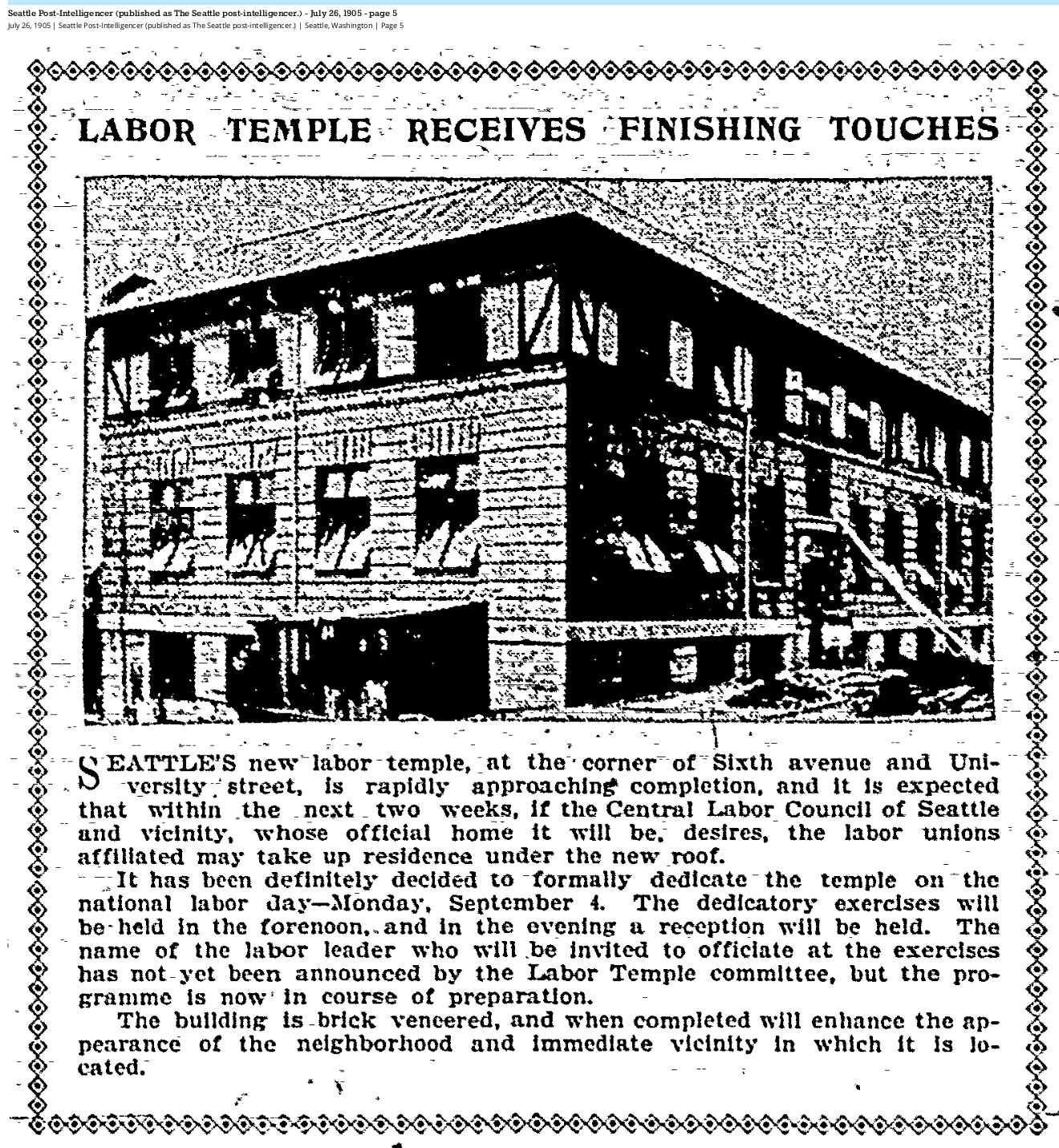 1905 07-26 SPI p5 May 16, 2023 1320 × 1431 Seattle Now & Then: Seattle Labor Temple, 1955 July 26, 1905, Seattle Post-Intelligencer, p5.