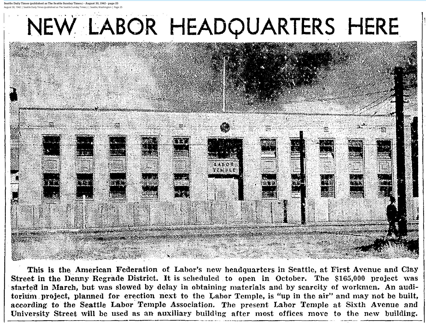 1942 08-30 STimes p25 May 16, 2023 1704 × 1293 Seattle Now & Then: Seattle Labor Temple, 1955 Aug. 30, 1942, Seattle Times, p25.
