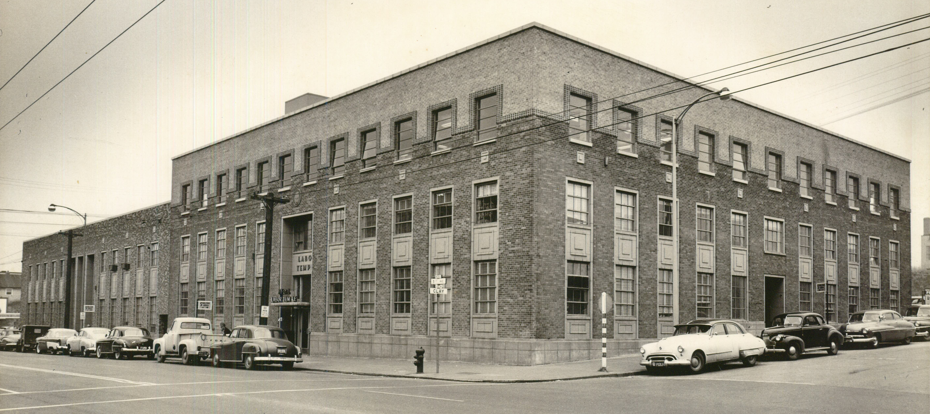 THEN: In this view looking north, the 1942 Seattle Labor Temple stands at the northeast corner of First Avenue and Clay Street circa 1955, shortly after its third floor was added. The temple’s 1946 auditorium addition is visible at left. (Courtesy Seattle Labor Temple Association)