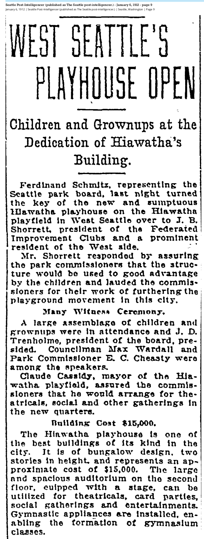 1912 01-06 SPI p9 May 31, 2023 693 × 1827 Seattle Now & Then: Hiawatha Playfield, 1911 Jan. 6, 1912, Seattle Post-Intelligencer, p9.
