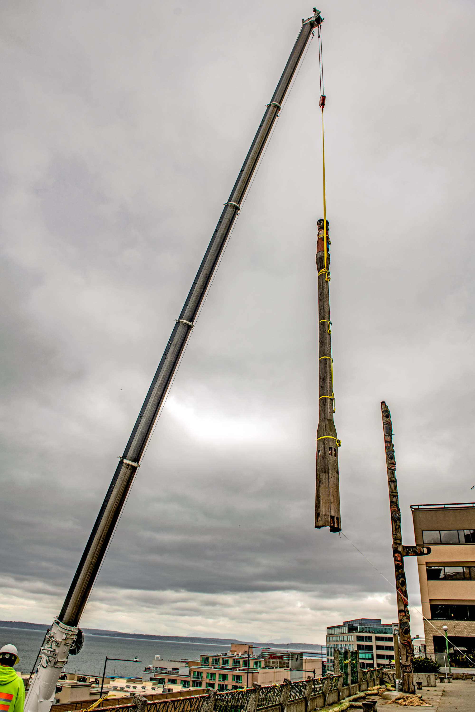 N&T Market poles NOW 3 June 7, 2023 2000 × 3000 Seattle Now & Then: Marvin Oliver poles, 1984 NOW3: Hoisted by a crane, the Farmer’s Market pole features male and female figures intended to memorialize the Pike Place Market’s farmer/producers.