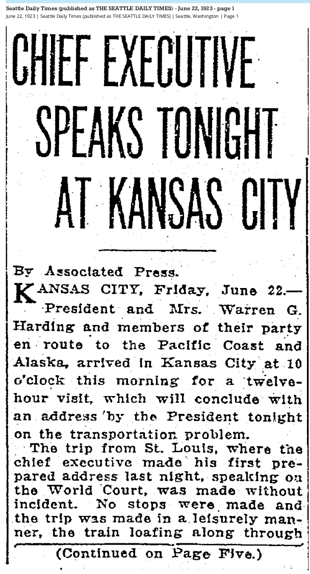 1923 06-22 STimes p1 July 12, 2023 608 × 1126 Seattle Now & Then: Harding, big crowds at Woodland Park & UW, 1923 June 22, 1923, Seattle Times, p1.
