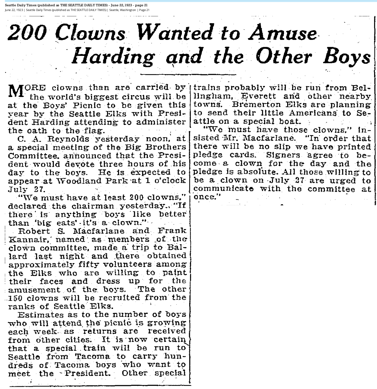 1923 06-22 STimes p21 July 12, 2023 1200 × 1239 Seattle Now & Then: Harding, big crowds at Woodland Park & UW, 1923 June 22, 1923, Seattle Times p21.